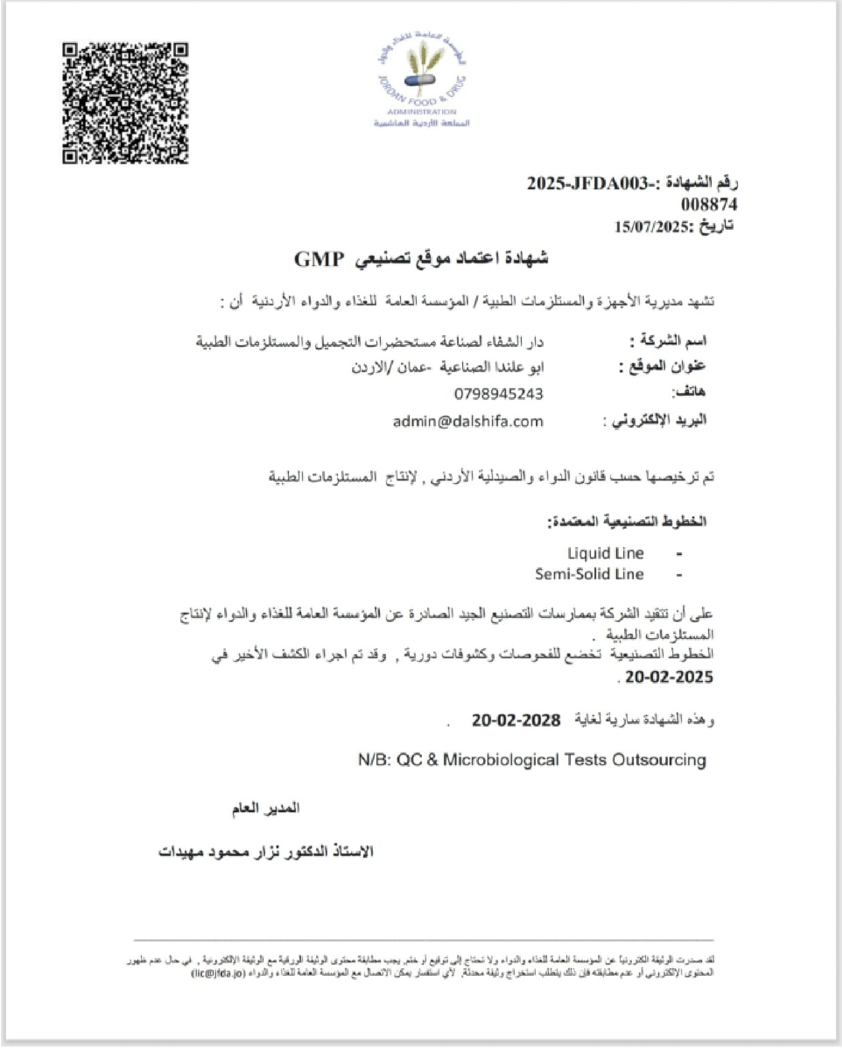 يسرّ شركة دار الشفاء لصناعة مستحضرات التجميل والمستلزمات الطبية أن تعلن وبكل فخر عن حصولها على شهادة ممارسات التصنيع الجيد (GMP) من المؤسسة العامة للغذاء والدواء الأردنية (JFDA)، وذلك لكل من خط إنتاج مستحضرات التجميل والمستلزمات الطبية.